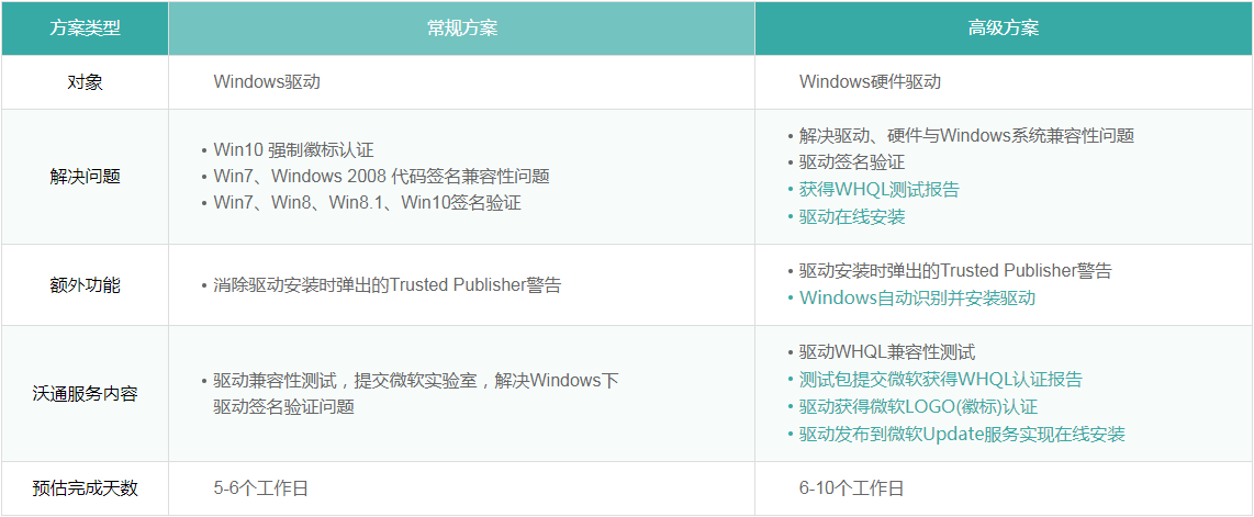 所以,以后的微软驱动签名认证几乎只能依靠WHQL来进行,WHQL对绝大多数企业来讲存在比较高的门槛,为了解决驱动程序开发企业的这一问题,我们推出 WHQL认证服务方案,驱动开发者可根据自己的需求来选择需要进行验证的系统。