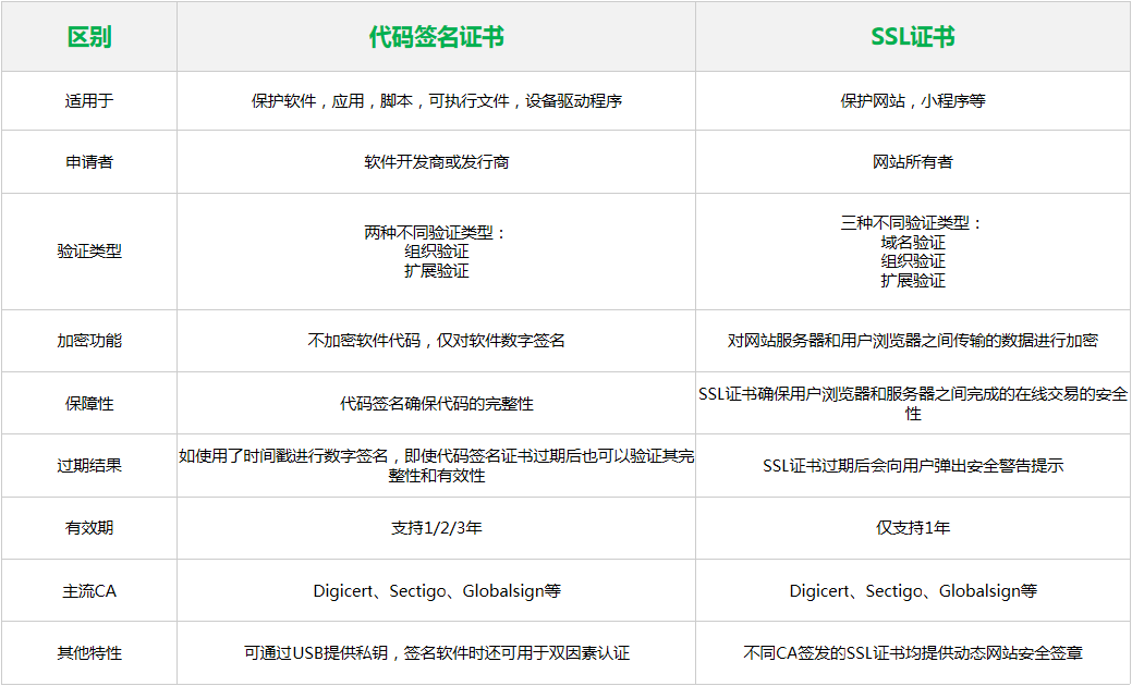 根据代码签名与SSL证书对比图可知,两类数字证书在各自的应用场景中都非常重要。随着用户对软件和网站安全意识的增强,使得软件开发商、发行商、网站管理员必须使用数字签名和SSL协议来为用户提供最大程度的安全保护,这也正是代码签名证书和SSL证书功能所在!