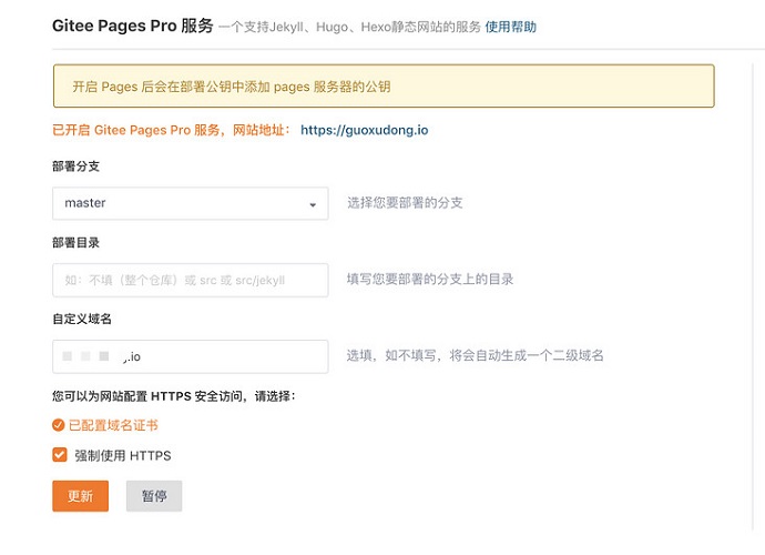 注意:如果要在Gitee Pages上配置自定义域名+HTTPS,则需要开启Gitee Pages Pro。