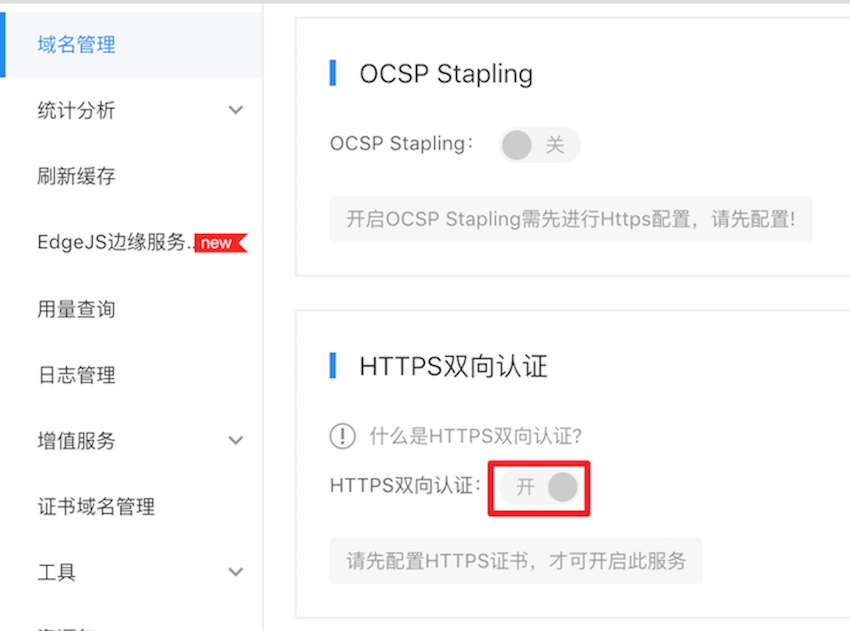 在开启 HTTPS双向认证 功能前,您需要确保已成功配置 HTTPS 证书。