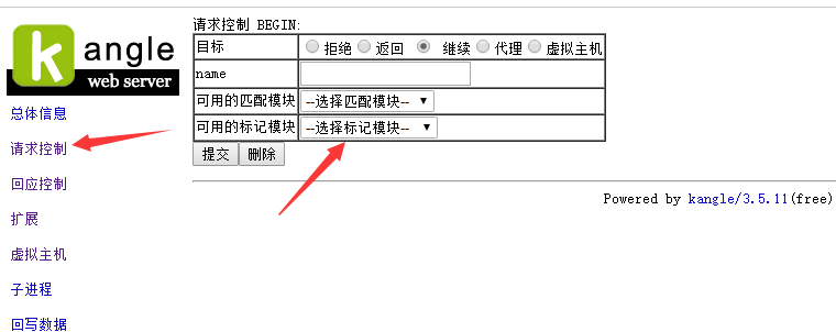 2、不支持伪静态的可以进入kangle后台ip:3311,选择:请求控制
