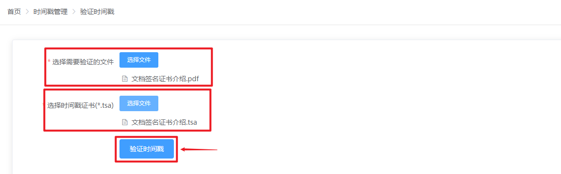 2、上传原文件以及.tsa文件后,点击下方的验证时间戳按钮