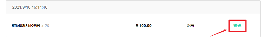 4、在我的订单中找到时间戳认证次数,并点击管理进入时间戳管理系统;