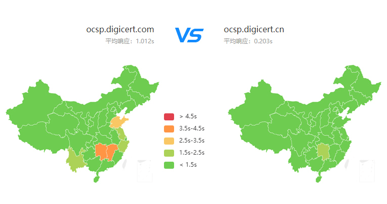 沃通CA所提供的 DigiCert 等系列SSL证书均做了 OCSP 中国本地化加速设置(使用了 CDN 加速),我们可以查看有无中国本地化加速的 OCSP 响应对比
