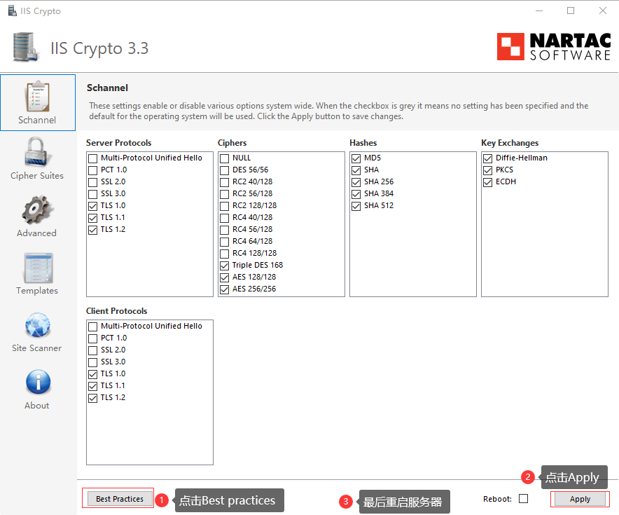 方案一、IIS Crypto工具启用TLS1_2协议,操作完毕重启服务器,具体如下: