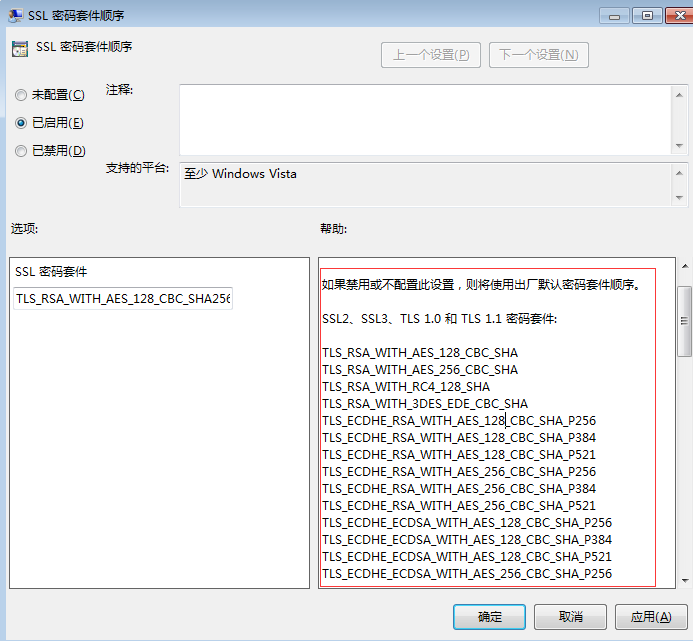 开始菜单——运行、输入gpedit.msc 进行加密套件调整 在此操作之前需要先开启TLS1_2协议