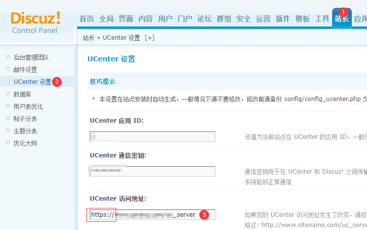 2、站长——UCenter 设置——UCenter 访问地址改成:https://www.wosign.com/uc_server
