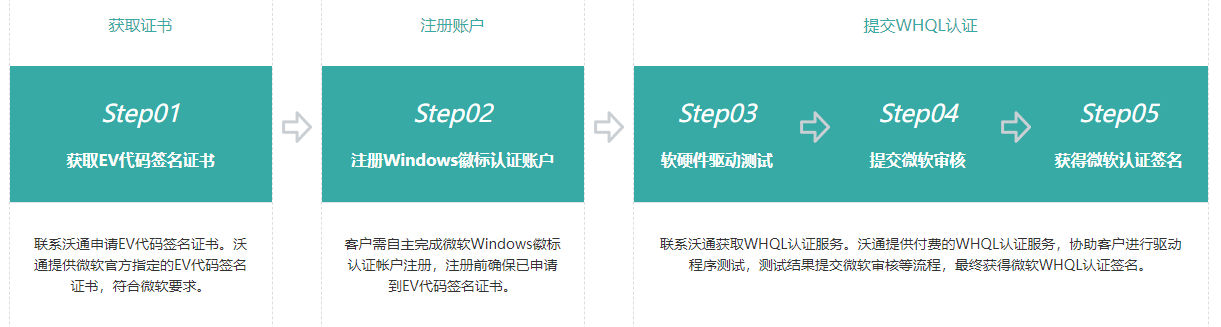 驱动程序提交WHQL认证的过程中都需要用到EV代码签名证书,开发者需提前申请EV代码签名证书备用。微软要求使用指定CA机构颁发的EV代码签名证书,开发者可通过沃通CA申请获取符合微软要求的EV代码签名证书。