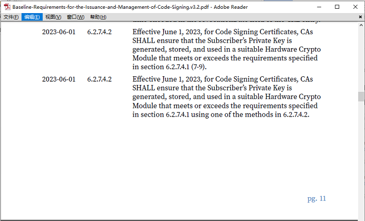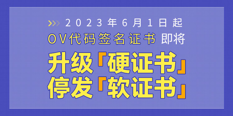 发布日期:2023-04-28国际组织CA/B论坛(CA/B Forum)在最新版本的《基线要求》中提出:从2023年6月1日起,新颁发的OV代码签名证书及私钥必须在安全硬件中生成并存储。