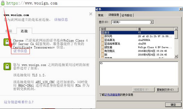 大家都知道使用HTTPS证书的网站网址会以https开头,我们可以点击绿色安全锁-点击详细信息-来查看其HTTPS证书信息,如下图所示: