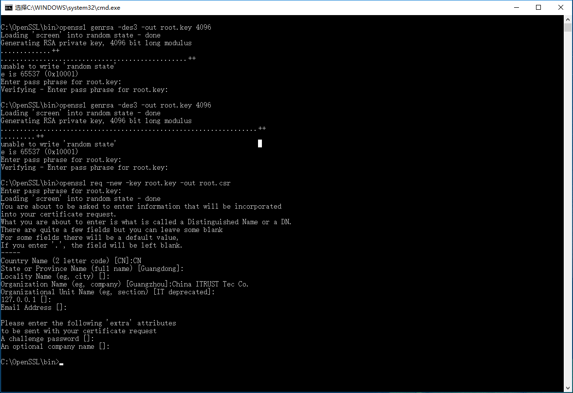 使用上面生成的根root证书来签发中级inermediate证书,命令: