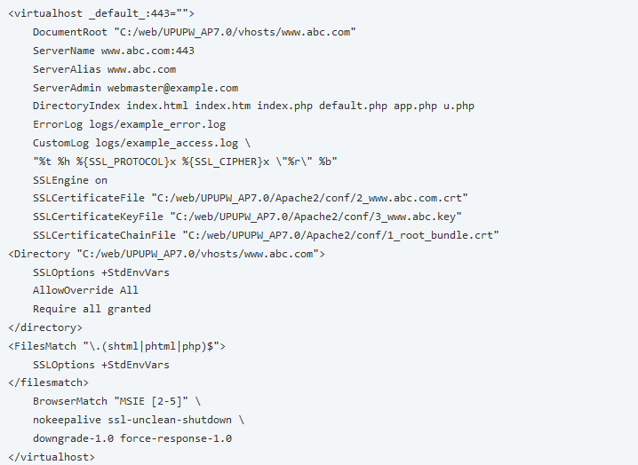 SSLCertificateKeyFile "C:/web/UPUPW_AP7.0/Apache2/conf/3_www.abc.key"中的C:/web/UPUPW_AP7.0/Apache2/conf/3_www.abc.key改为你证书密钥的绝对路径。如果有证书链,则在下一行