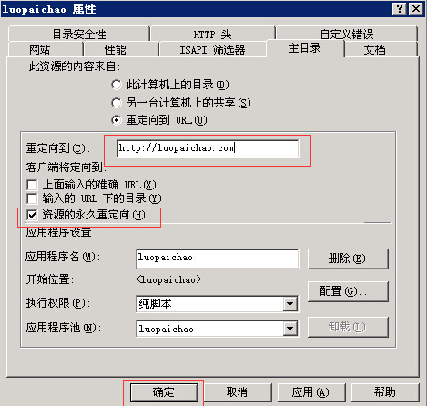 创建好后站点后,选择该站点,点击鼠标右键--“属性”--“主目录”,按照下图设置,选中“重定向到URL”,重定向的地址是“https://域名$S$Q”并勾选“上面输入的准确URL”和“资源的永久重定向”两个选项即可。/p>