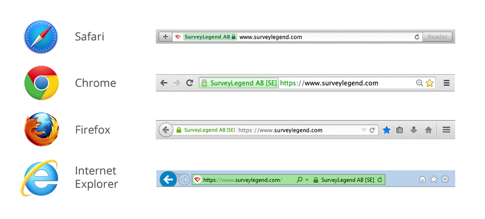 根据浏览器的不同,这两种标志的具体外观也会不同。有时公司名称以绿色书写,有时位于一个绿色矩形框内。下面是几个主要的浏览器中EV证书的形式的例子: