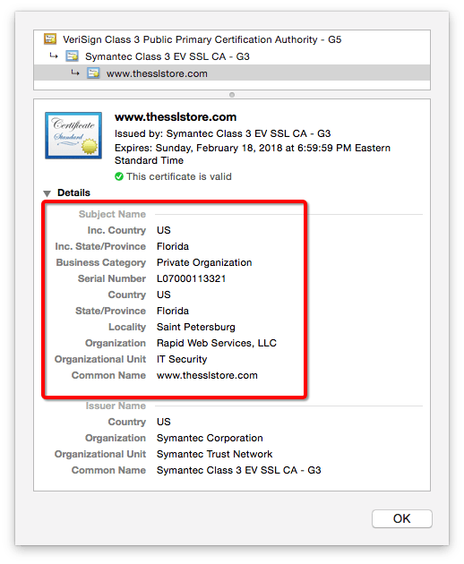 主体是该证书所代表的网站或组织。根据证书(DV、OV或EV)类型的不同,你会在主体中看到数量不等的信息。一个DV证书只有一个域名。一个OV证书会包括有限的公司信息(名称、州/省和国家)。一个EV证书会有详细的公司信息,甚至包括精准的街道地址。如果浏览器显示绿色地址栏的话,你就可以认可EV证书。扩展验证证书提供的信息最多——这就是为什么它有一个特殊的视觉标志的原因。