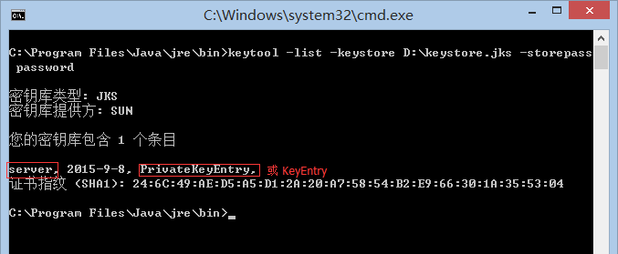 keytool -list -keystore D:\keystore.jks -storepass password