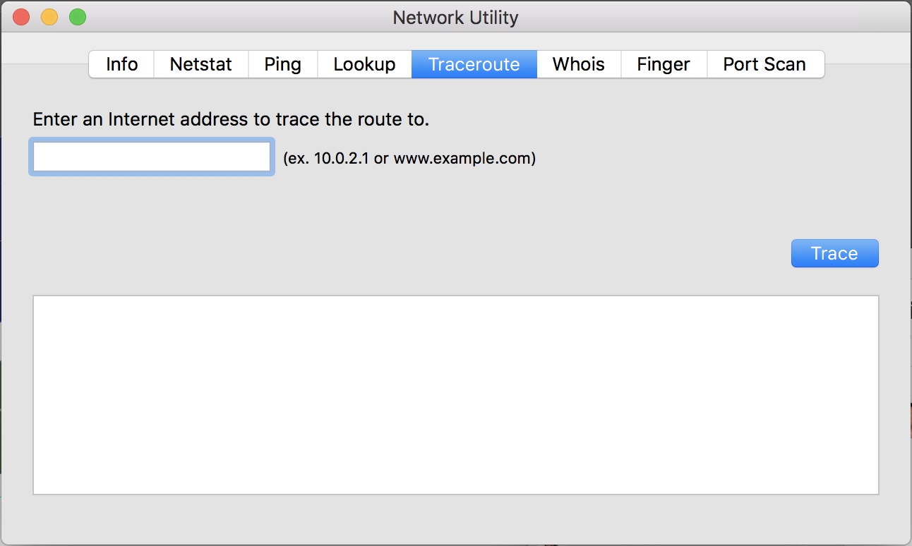 对苹果用户来说,这也是很简单的。在Mac的搜索栏中,键入“网络实用程序(Network Utility)”,然后点击打开它。然后导航到Traceroute选项卡,并在跟踪字段中输入域名。