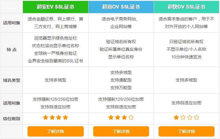 SSL证书主要有DV、OV、EV三种类型,加密强度也是逐级提升的。对于涉及到资金、机密信息传输、账户密码数据等对安全性要求高的网站,EV SSL证书是最合适的选择。对于安全性要求没那么高的网站,则可以选择安全性略低,但价格更实惠的SSL证书。