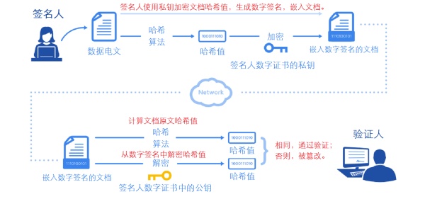 数字签名简化流程大致为:发送数据电文时,发送方用一个哈希函数(HASH)从数据电文文本中生成数据电文摘要,然后用自己的私钥对这个摘要进行加密,这个加密后的摘要将作为数据电文的数字签名和数据电文一起发送给接收方,接收方首先用与发送方一样的哈希函数从接收到的原始数据电文中计算出数据电文摘要,接着再用发送方的公钥来对数据电文附加的数字签名进行解密,如果这两个摘要相同,那么接收方就能确认该数字签名是发送方的。