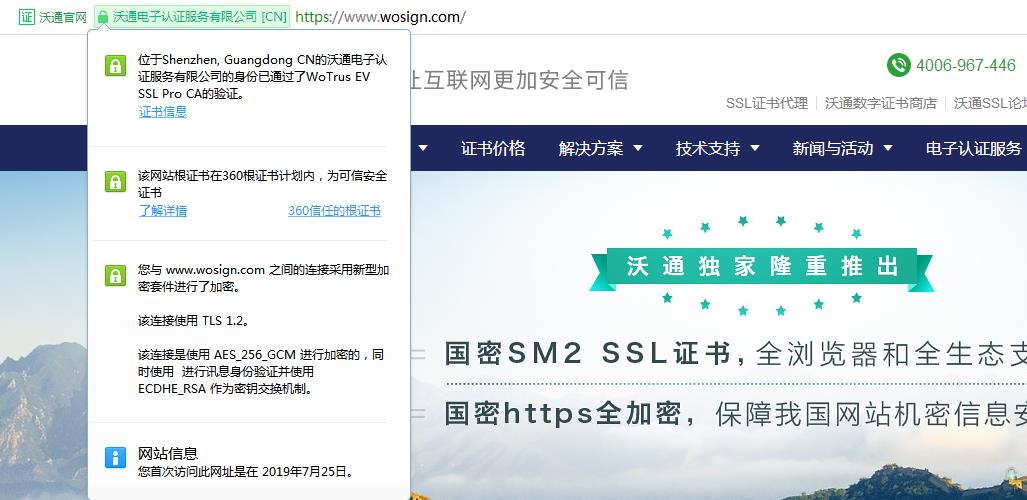 沃通作为国内领先的SSL证书签发CA,早在2014年就已经开始了采用国密算法签发SM2 SSL证书的研究,并取得了可喜的研究成果。我们充分认识到国密SSL证书要达到实用和大量部署使用还需要相关系统的支持,如浏览器和服务器软件。同时,还要考虑到其通用性与全球性,即网站用户可能使用各种不同的浏览器和用户来自世界各地。所以,我们一直在持续研究基于国密算法实现https网站加密的完整解决方案。