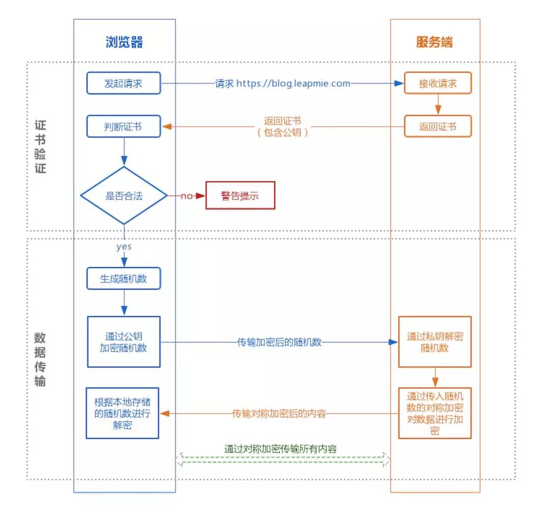 A: 客户端发起HTTPS请求,服务端返回证书,客户端对证书进行验证,验证通过后本地生成用于改造对称加密算法的随机数,通过证书中的公钥对随机数进行加密传输到服务端,服务端接收后通过私钥解密得到随机数,之后的数据交互通过对称加密算法进行加解密。