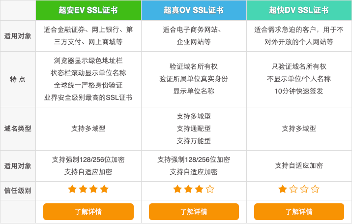 根据企业需求,可选方案很多,这里推荐如下几种证书,建议您与在线客服具体沟通,根据您的需求做最佳的选择。以下价格可能有变化,以客服提供给您的最终优惠价为准。