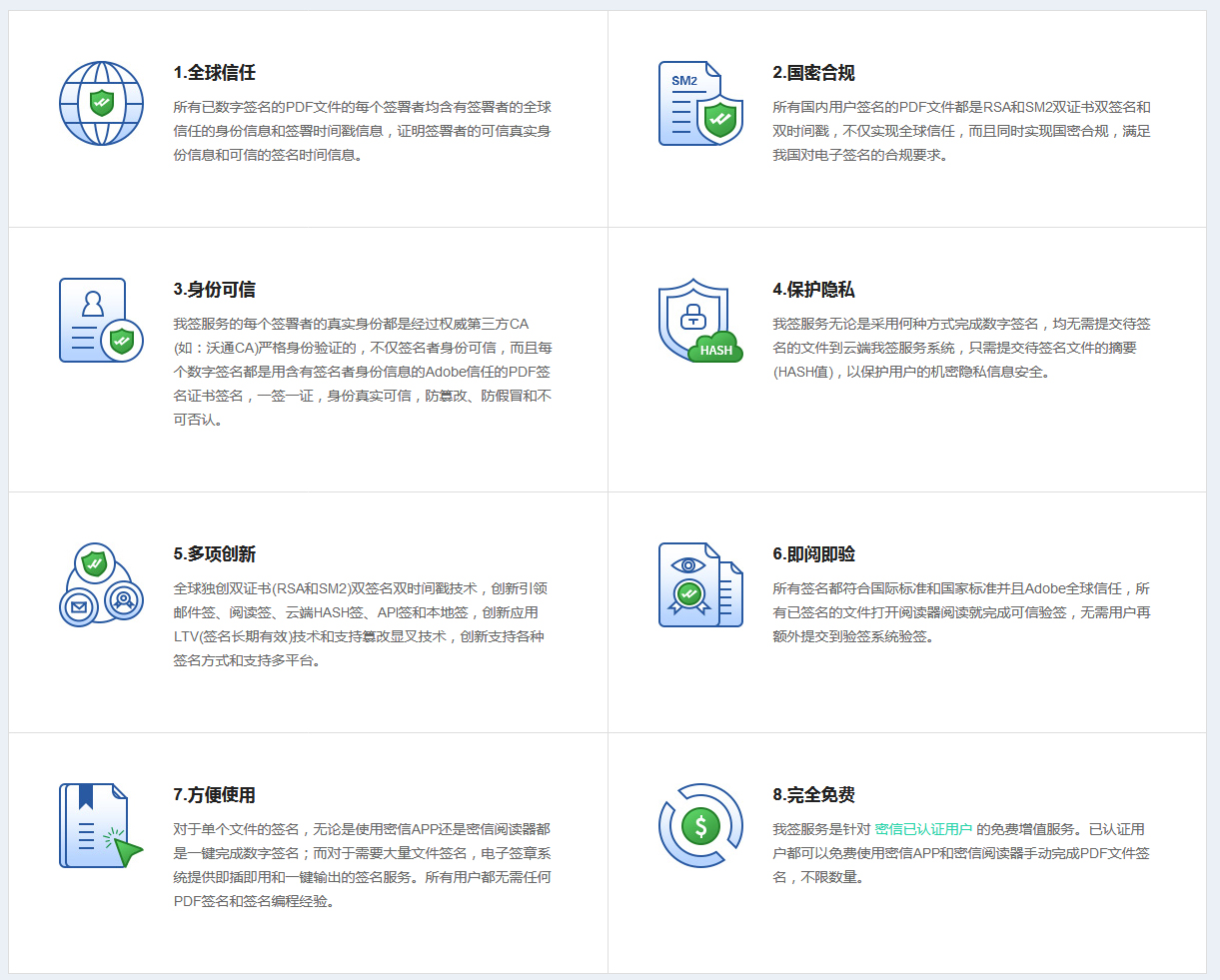 我签(MeSign)电子签名服务是一个面向全球用户的全面创新的、方便快捷的电子文档和电子合同电子签名服务,所有文档全部采用Adobe全球信任的PDF签名证书和国密合规的文档签名证书实现双签名和双时间戳,确保全球信任和国密合规,支持客户端软件内手动签署(密信邮件客户端内或密信阅读器内)、调用云端API接口批量签署、本地部署电子签章系统批量签署等不同应用模式。我签电子签名服务区别于市面上大多数电子签名服务,具备如下产品优势:Adobe全球信任、符合国密标准及法规要求、身份可信、保护隐私、方便使用。
