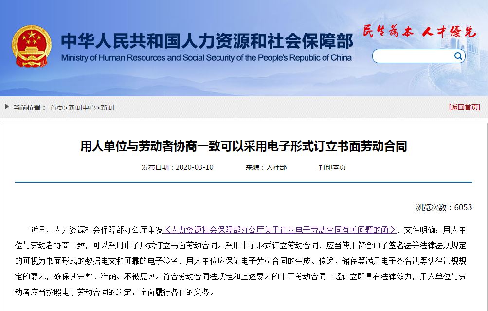 近期,人力资源社会保障部办公厅印发《人力资源社会保障部办公厅关于订立电子劳动合同有关问题的函》(人社厅函〔2020〕33号),明确用人单位与劳动者协商一致,可以采用电子形式订立书面劳动合同。文件明确: