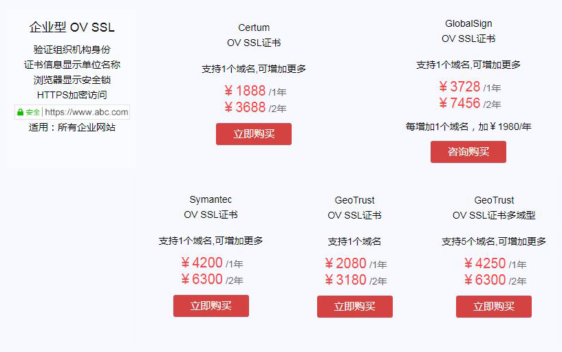 Certum OV SSL即Certum 企业型多域名版SSL证书1888元每年,支持添加域名,每增加一个域名,每年的费用增加1000元,最多支持增加被保护的域名数量至250个。