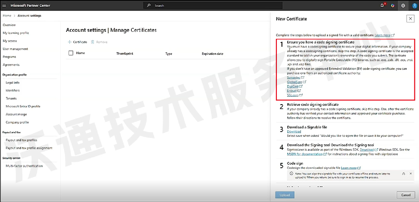 注意:就是在这一步,需要使用企业已申请的EV代码签名证书,签名指定文件,然后上传该已签名文件,微软将从已签名文件中提取已验证的企业真实身份,完成注册流程。