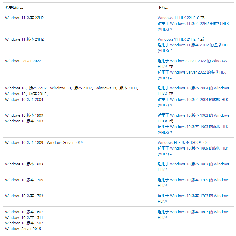 如果开发者需要针对 Windows 10 或限定版本的 Windows Server 进行开发,则必须使用该系统对应的HLK 版本,使用正确的HLK工具包版本才能确保驱动程序与对应的Windows操作系统兼容,具体版本对照表见下图。