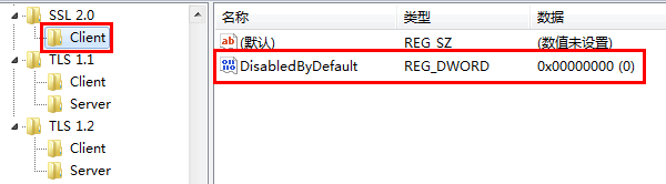 打开HKEY_LOCAL_MACHINE\SYSTEM\CurrentControlSet\Control\SecurityProviders\SCHANNEL\Protocols\SSL 2.0\Client 配置如下