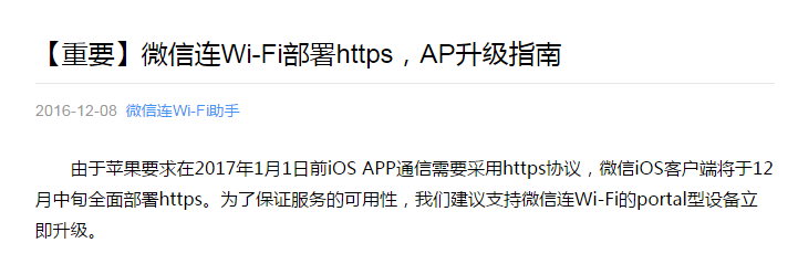“由于苹果要求在2017年1月1日前iOS APP通信需要采用https协议,微信iOS客户端将于12月中旬全面部署https。为了保证服务的可用性,我们建议支持微信连Wi-Fi的portal型设备立即升级。”