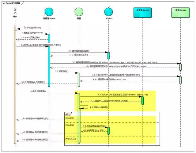 b. 网络认证中,向authURL发起认证请求的步骤可能受到影响,具体如下图标黄区域(步骤4.1—4.6):