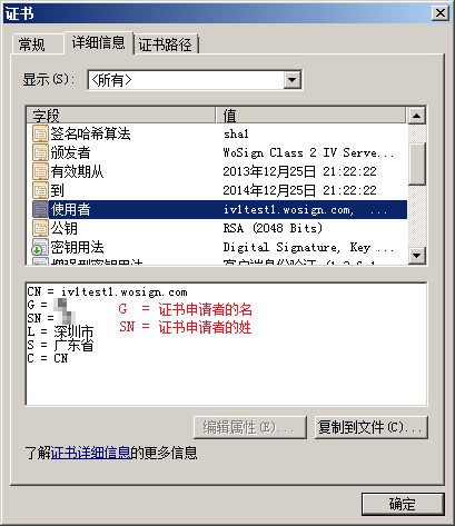 如下图所示为超酷SSL证书,颁发者为:WoSign Class 2 IV Server CA,证书主题中 “SN” 与 “G” 字段会显示证书申请人的姓与名。证书路径会显示WoSign顶级根证书为:Certification Authority of WoSign。