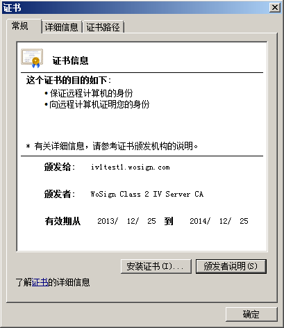 | 颁发根证书 | Certification Authority of WoSign -- WoSign Class 2 IV Server CA |