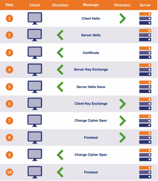 第1步:整个连接/握手从客户端向服务器发送“客户端问候”消息开始。该消息由加密信息组成,如支持的协议和支持的密码套件。它也包含一个随机值或随机字节串。