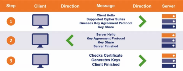 第1步:与TLS 1.2握手类似,TLS 1.3握手从“客户问候”消息开始并包含一个重大变化。客户端发送支持的密码套件列表并猜测服务器可能选择的密钥协议协议。客户端还发送其特定密钥协议协议的密钥份额。