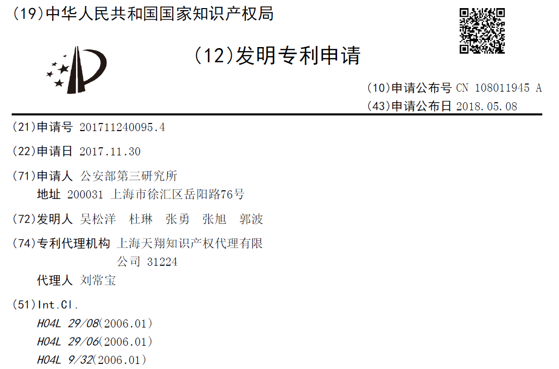 发布日期:2018-05-115月8日,据中国知识产权局公布的数据,公安部第三研究院于2017年11月30日提交了一项基于区块链的系统专利申请,这是一项云取证过程记录方法及系统,可以实现对数据存在的强有力证明,实现防篡改。