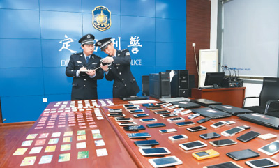 山东省菏泽市定陶区公安局反诈骗中心民警正在对收缴的赃物进行清点。朱建英摄(人民图片)