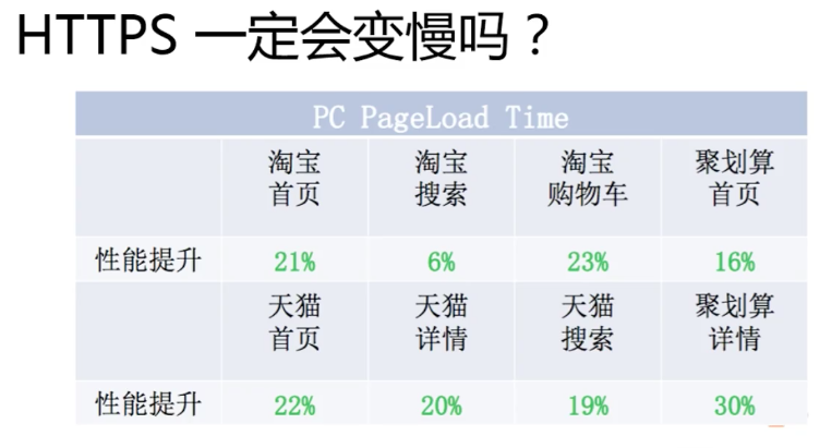 下图,是淘宝和天猫使用了HTTPS后的一些性能提升数据。其实我们可以看到,淘宝首页和搜索、聚划算、天猫等页面中,性能都是正向提升的。所以接下来,我们看看CDN HTTPS在性能方面到底做了哪些优化?