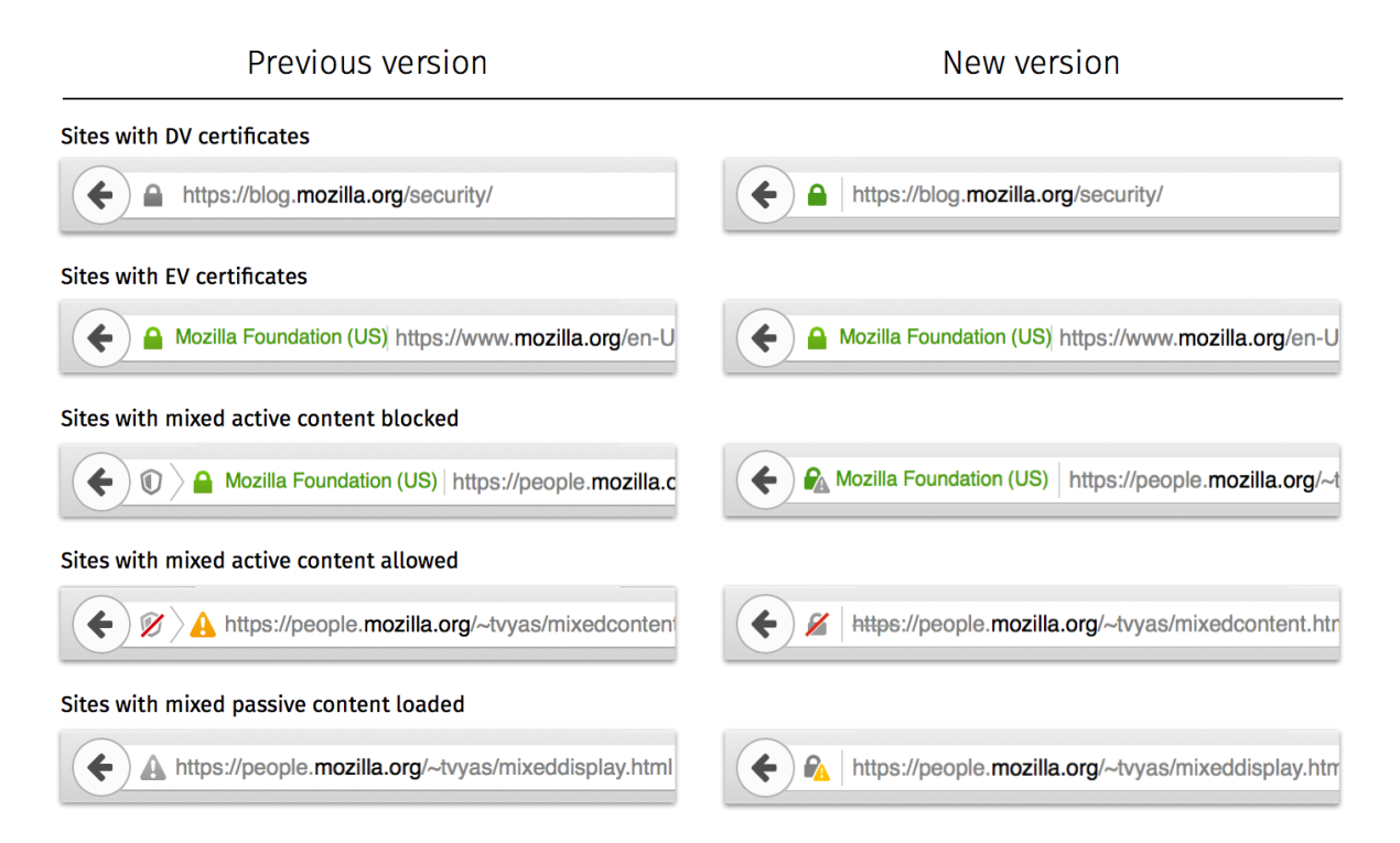在过去的几个月里,Mozilla一直在不断提高Firefox个人隐私和安全功能的用户体验。在火狐浏览器地址栏上的安全状态反馈显示就是一项具体举措。每项主要变化都在下面重点标注,并附上每项变化背后的原理。