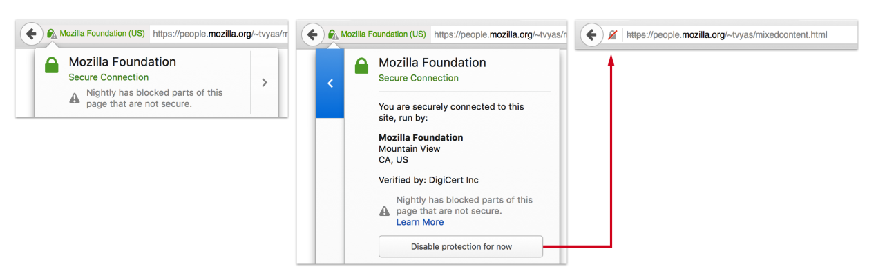 此前用户可以点击在罕见的情况下,他们需要重写混合内容保护的盾牌图标。有了这个新的用户界面,用户仍然可以通过单击箭头图标,揭露有关网站安全性的更多信息,以及一个禁用保护按钮做到这一点。