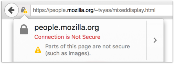 有混合内容的第二类称为Mixed Passive Content混合被动内容。默认情况下 Firefox不会阻止混合被动内容。然而,当它在HTTPS页面上加载时,我们通过图标和文本让用户知道。在Firefox以前的版本中,我们使用了灰色的警告标志。