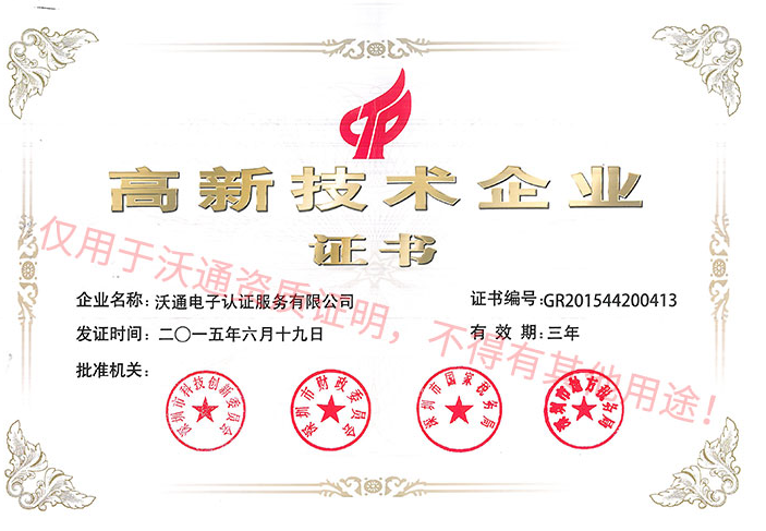 沃通CA荣获"国家高新技术企业"称号,高新技术中国制造!