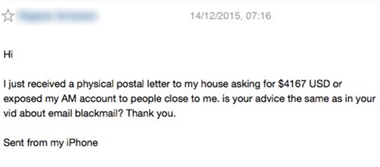 或许是分账不均,又或者是贪心不足。这帮黑客在事件过去4个月之后,再次出来活动。一些用户在邮箱中发现了黑客发出的勒索邮件,邮件中黑客表示要想自己的信息不被曝光,就必须向他们支付赎金。赎金交易以比特币和美元为主,Ashley Madison会员Graham Cluley 就是被勒索的其中一个。他被要求缴纳4167美元的封口费——否则就将他的账号信息告知他的家人。