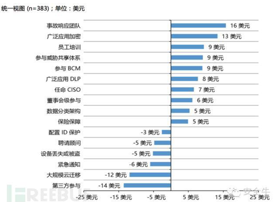 我们看到,医疗的数据在355美元一条,企业的一些措施可以降低数据泄露的成本,例如事件响应团队、广泛应用加密、员工培训、参与威胁共享体系或业务持续性管理均有助于降低数据泄露时每条记录平均成本。而第三方参与、大规模云迁移、紧急通知或设备丢失/被盗所引发的数据泄露则会增加泄露的平均成本。