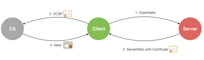 在线证书状态验证采用了 OCSP(Online Certificate Status Protocol 在线证书状态协议)协议去验证。但如果按上面这个方式,那HTTPS 就慢死了,不实用,所以有了OCSP stapling 方式,其流程如下: