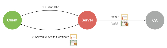Server 端会定期去CA同步一份经过CA 认证签名的证书状态检查结果并伴随 ClientHello 响应返回给 Client 端。因为这个结果是CA 自己通过数字签名,Server 也无法伪造或篡改,因此Client 可以信任这个结果,以达到减少不必要的步骤提升性能的效果。