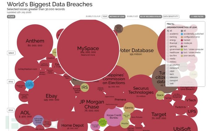 同时,社交网络不是唯一的突破口,下面是世界上最大的数据泄露事件统计图: